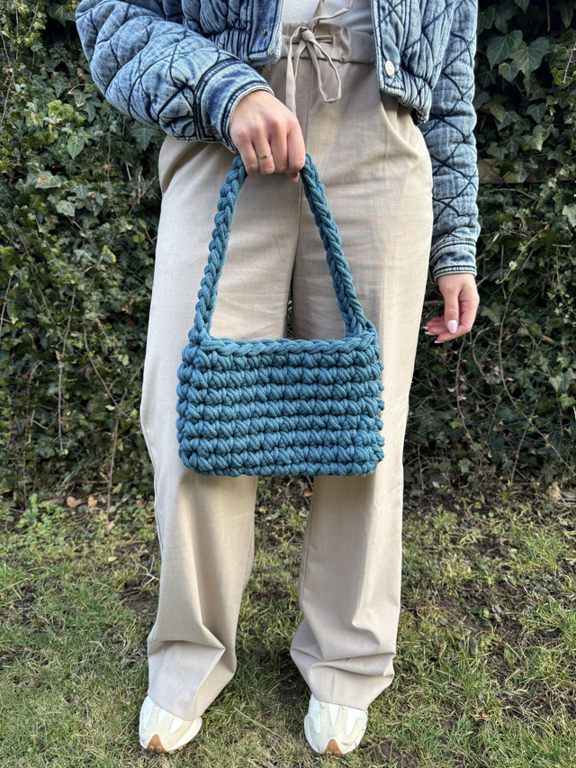 ♻️ Confectionné à la main avec du fil de coton recyclé bleu, provenant d’Europe.