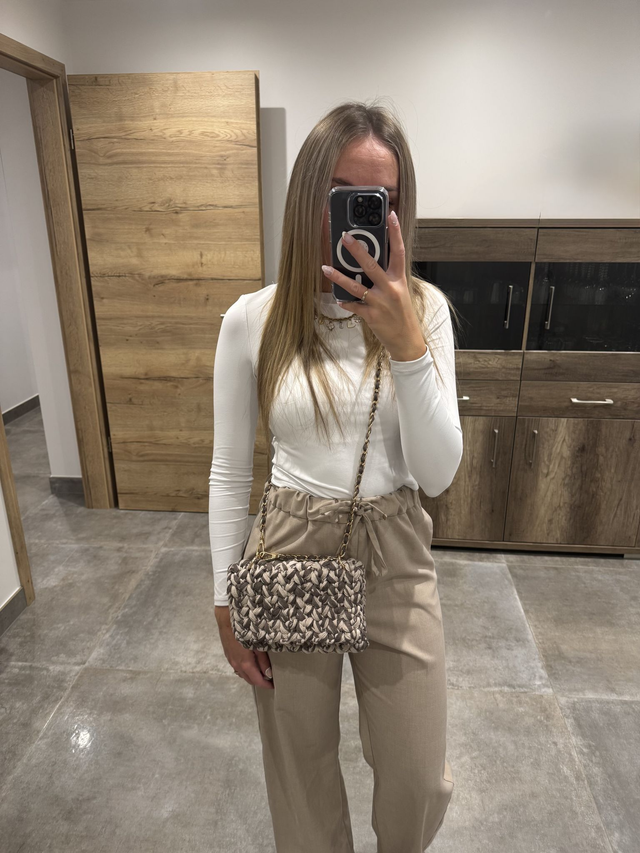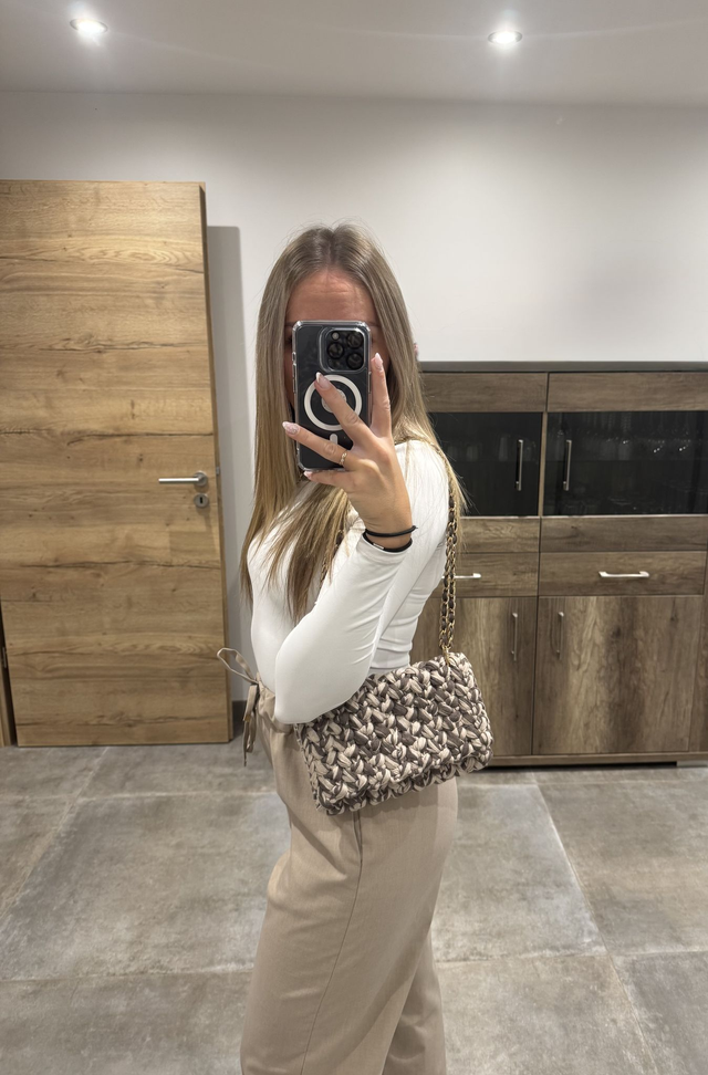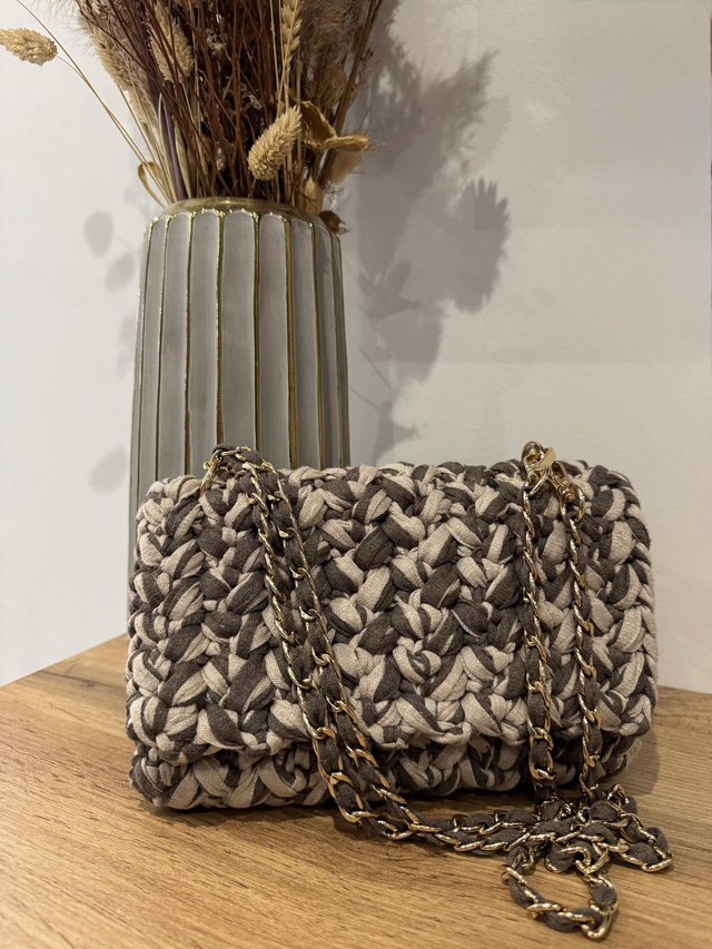 Son mélange de fil de coton recyclé beige et brun crée un contraste subtil et naturel, qui lui donne un style chic et moderne. Avec sa chaîne dorée, il se porte aussi bien à l’épaule qu’en bandoulière, pour des looks raffinés en toute simplicité.