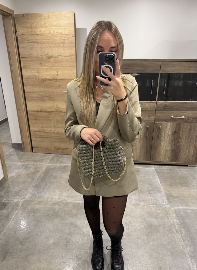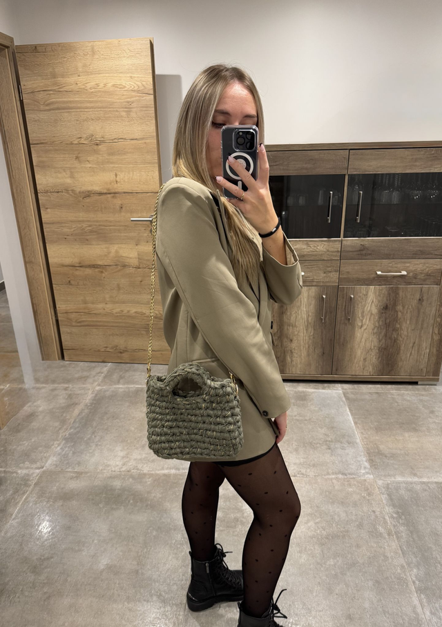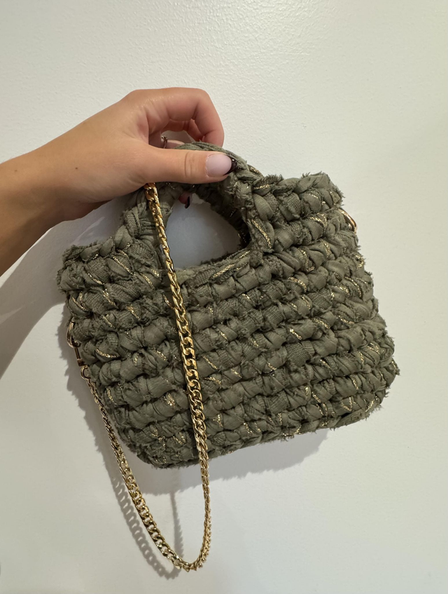 Ce sac mélange originalité et élégance avec son fil de t-shirt recyclé vert associé à un fil doré qui apporte une touche lumineuse. Il se porte aussi bien à la main qu’en bandoulière grâce à sa chaîne, parfait pour s’adapter à toutes vos sorties.